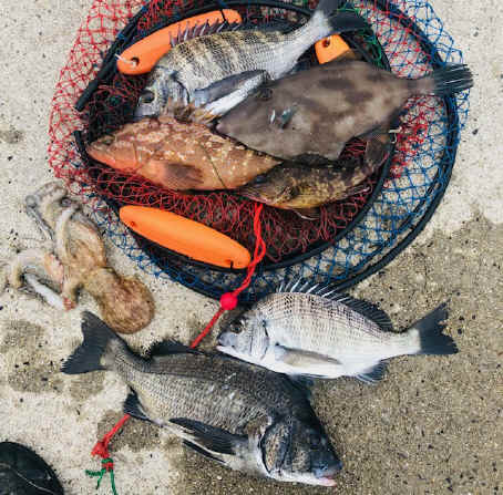 チヌ3尾(30〜38cm),アコウ(33cm),ウマヅラハギ,カサゴ(20cm),マダコ