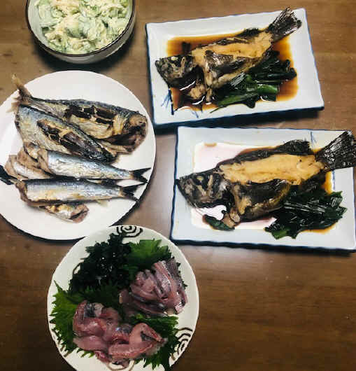メバルの煮付け,アジとイワシの刺身と塩焼き