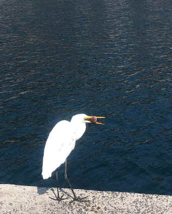 サギがすぐ近くまで寄ってきたので,釣れた小カサゴを投げてやった。