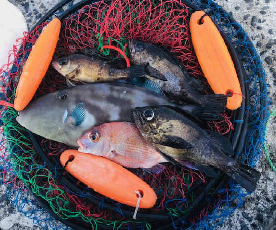 おかずにするには十分すぎるほど釣れたので,今度は外向きでカゴをやったが,スズメダイが多くノーヒット。